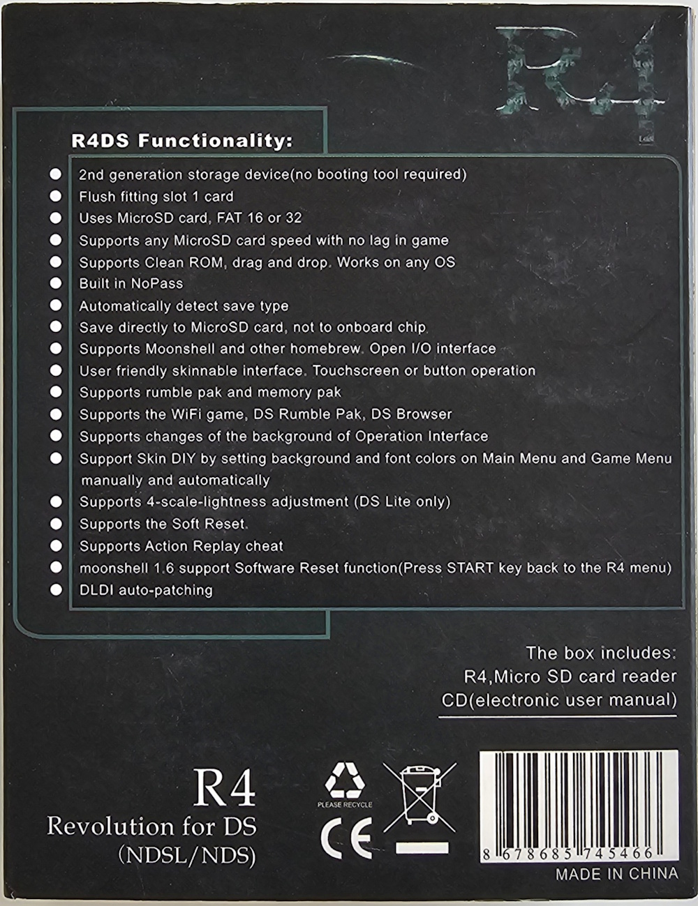 1:1 clones of the original R4 used be sold on AliExpress up until around 2024, and are can still be easily obtained on the used market, however it is not recommended to buy them due to the lack of SDHC support. The main advantage of this cart was that the Wood R4 1.62 kernel had excellent compatibility with games.